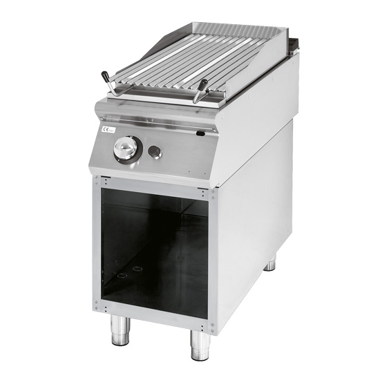 Seitenwände, Boden und Rückseite aus Edelstahl. Arbeitsfläche hergestellt aus Edelstahl AISI 304 15/10. Kamin aus emailliertem Gusseisen. Stahlbrenner mit Pilotflamme und Sicherheitsthermoelement. Gasversorgung gesteuert durch Gashahn mit Sicherheitsventil. Edelstahlrost mit V-förmigen Stäben. 3-seitiger Spritzschutz aus Edelstahl AISI 304. Herausnehmbare Fettauffangschale. Lavasteingrills sind mit einer mechanischen Gitterhebevorrichtung, um die Wärme besser kontrollieren zu können. Speziell designte Knöpfe, um das Eindringen von Wasser in das Bedienfeld zu vermeiden.